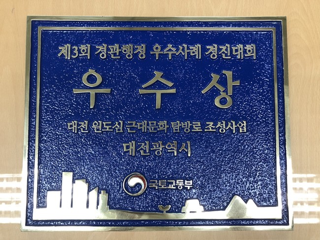 대전시는 국토부 주관으로 시행한 제3회 경관행정 우수사례 경진대회에서‘원도심 근대문화탐방로 조성사업’이‘우수상’을 수상했다고 15일 밝혔다.
