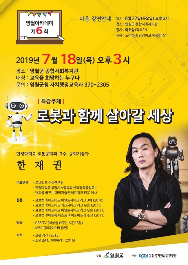 영월군은 오는 18일 오후 3시 영월군 종합사회복지관에서 한양대학교 로봇공학과 한재권 교수를 초청해 “로봇과 함께 살아갈 세상”이라는 주제로 영월아카데미를 연다.