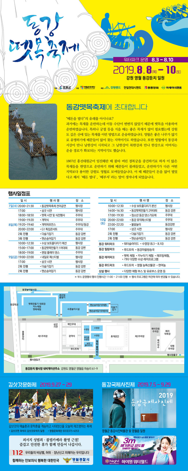 한편, 2019 영월 동강뗏목축제는 8월 8일부터 10일까지 사흘간 영월동강둔치 일원에서 개최되며, 뗏목만들기대회 외에도 ‘뗏목시연" 행사와 대형워터슬라이드, 맨손송어잡기, 래프팅 등 시원한 수중행사 및 유명가수 콘서트 등 다양한 부대행사가 마련된다. 특히 축제를 찾는 어린이들에게 인기만점인 워터파크는 8월 3일부터 사전 운영한다.