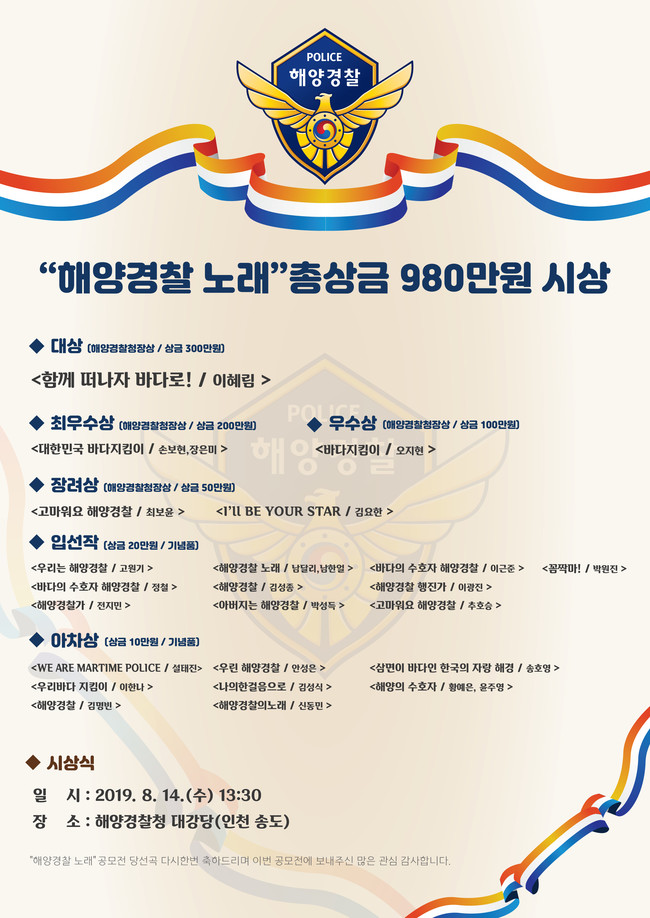 성대훈 대변인은 “앞으로도 노래 공모 등 문화를 통해 국민과 함께 하는 해양경찰로 거듭나겠다”고 밝혔다.