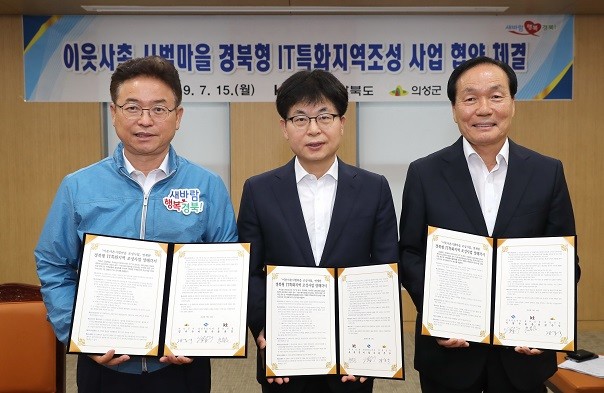 의성군은 15일 오전 10시 경북도청에서 이철우 경상북도지사, 김주수 의성군수, 윤종진 KT홍보실장 등 3개 기관 관계자가 참석한가운데 이웃사촌 시범마을 조성사업과 연계한 경북형 IT특화지역 조성사업 양해각서를 체결했다.