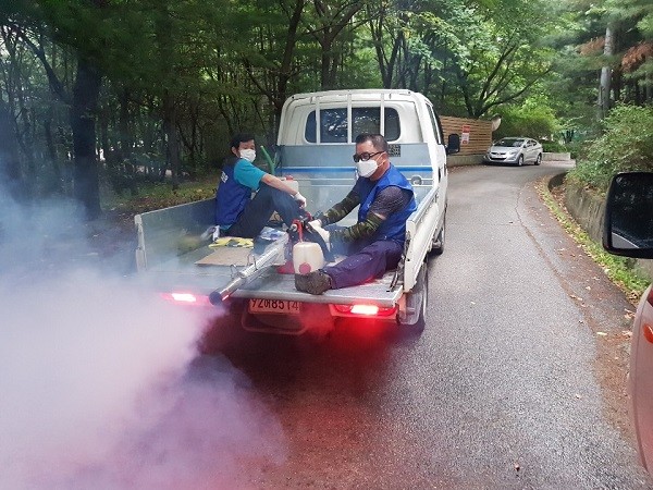 이번 방역소독은 다산행정복지센터 관계공무원과 다산1동 지역자율방재단 10여명이 참여해, 1톤 트럭 2대 및 휴대용 방역소독기 2대를 동원, 보아주택 일원 및 미금중학교 일원과 민원이 지속적으로 발생된 부영2단지 뒤편 야산 및 신우연립 일원과 중촌마을 다세대 밀집 지역 등에 집중 방역소독을 실시했다.
