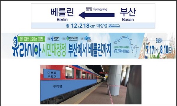 오거돈 시장과 단원들이 탑승하는 열차는 부산역을 오전 9시 57분에 출발하는 무궁화호 열차로, 바깥 벽면에는 ‘부산→평양→베를린 1만2천218km 대장정’이라고 적힌 이정표와 ‘유라시아 시민대장정 부산에서 베를린까지’라고 적힌 대형 현수막도 부착한다.