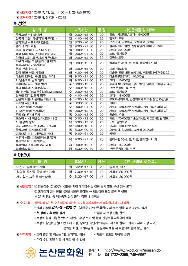 한 강좌 당 정원은 20명으로 선착순 접수이며, 수강료 및 강좌에 따른 별도의 재료비는 자부담이다.