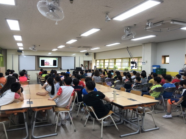 학년별 눈높이에 맞는 애니메이션 자료를 시청하며 시작된 교육은, 알레르기와 연관이 있는 아토피·천식·알레르기 비염에 대해 알아보고 예방법을 배울 수 있는 시간이었으며 아이들도 손을 들며 대답하는 등 적극적으로 교육에 참여했다.