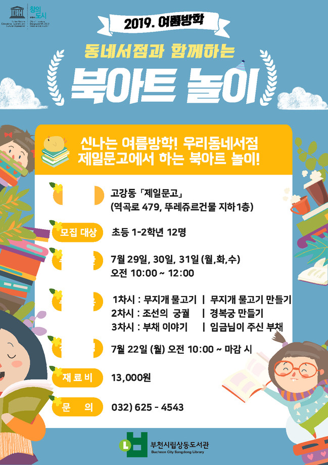 북아트 전문가 신미영 강사와 함께하는 이번 수업은 7월 29일부터 31일까지 진행되며 초등 1~2학년생 12명과 함께 무지개 물고기, 조선의 궁궐, 부채 이야기 등 다양한 동화를 감상한 후 만들기 활동을 할 계획이다.