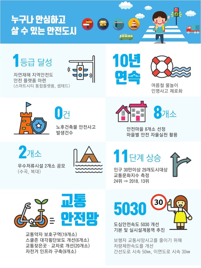 스마트시티 통합플랫폼 구축으로 각종 긴급 상황 발생 시 신속대응 가능토록 하고, 시외버스터미널 및 원룸밀집 범죄안전진단 취약지역에 범죄예방 환경설계 우선 사업 실시로, 시민안전서비스를 개선해 나가고 있으며, 민·관·산 화학사고 대비 협력 추진 및 종합적인 화학물질 사고예방대책수립, 시기별·분야별 안전관리 점검을 통해 시설물의 노후화·대형화 등 증가하는 각종 안전 위협 요인을 사전 예방에도 힘쓰고 있다.