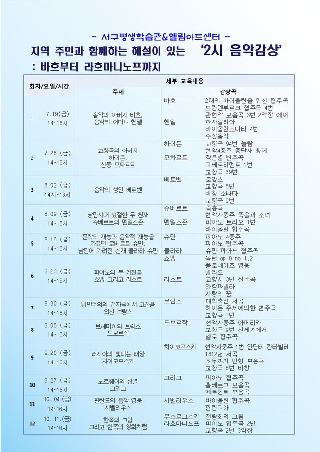 인천서구평생학습관과 엘림아트센터는 지역주민을 대상으로 ‘해설이 있는 2시 음악감상’ 교육프로그램을 오는 19일부터 10월 11일까지 운영하며 수강생을 모집한다.