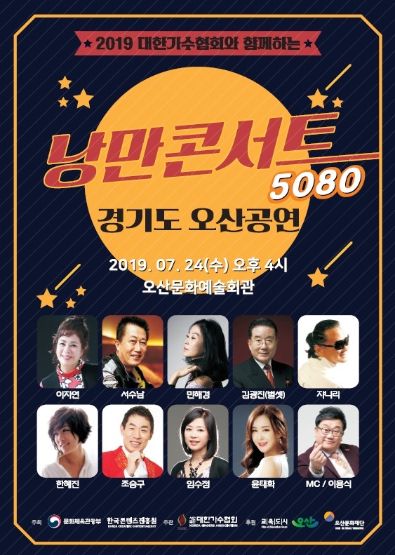 오산문화재단은 2019 대한가수협회와 함께하는 5080 낭만콘서트가 오산문화예술회관 대공연장에서 오는 24일 오후 4시에 펼쳐진다고 밝혔다.