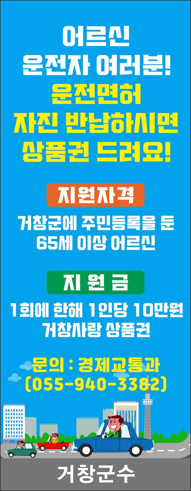 거창군 어르신 운전자 여러분, 운전면허 자진반납하시면 지원금을 드려요