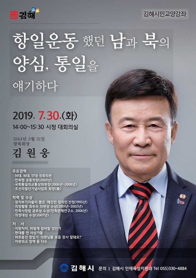 김해시는 오는 30일 오후 2시 시청 대회의실에서 김원웅 제21대 광복회장을 초청해 ‘항일운동했던 남과 북의 양심, 통일을 얘기하다’를 주제로 7월 시민교양강좌를 개최한다고 밝혔다.