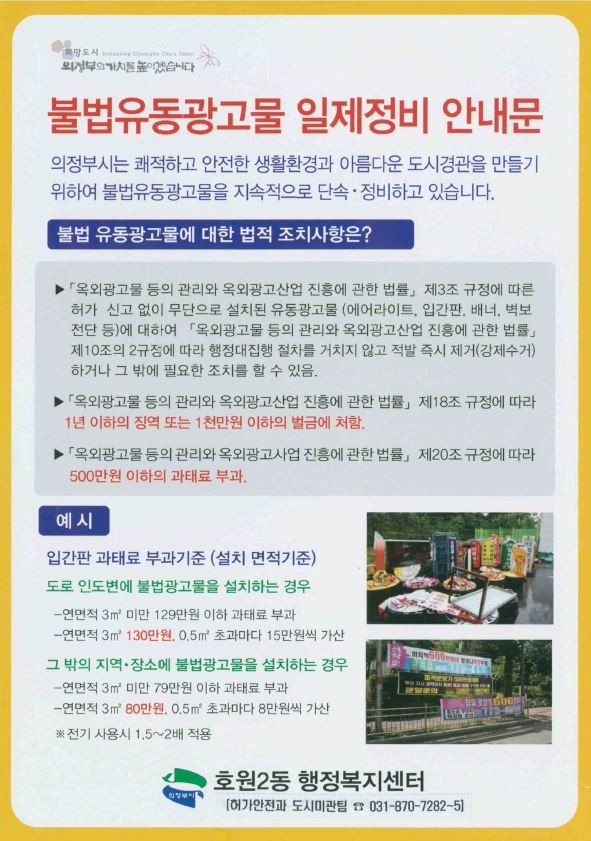 의정부시 호원2동 허가안전과는 지난 상반기에 이어 하반기에도 통행량이 많은 호원권역 내 1호선 전철역 주변 등 주요 인도 위에 무분별하게 설치되어 있는 불법 입간판을 일제 정비할 예정이다.