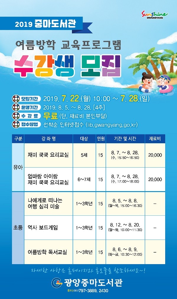 광양중마도서관에서는 여름방학을 맞아 유아와 초등학생을 대상으로 8월 한 달간 총 5개 ‘독서 교육 프로그램’을 운영한다고 밝혔다.