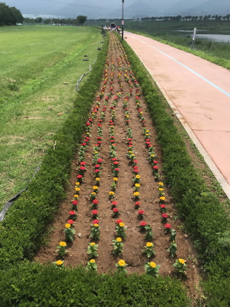 밀양강 둔치 산책로에 백일홍 화단 조성