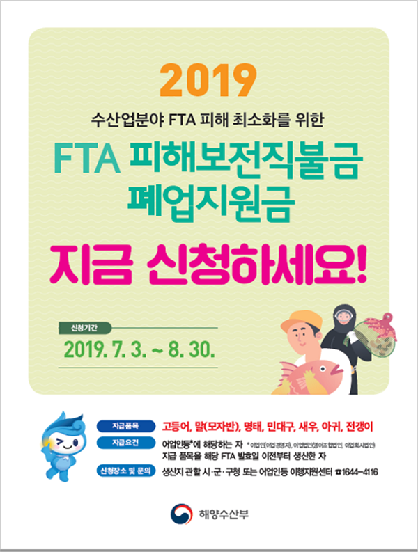 길해진 도 해양수산정책과장은 “도내 수산분야 FTA 피해보전직불금 및 폐업지원금 신청자격에 해당되는 어업인등이 한분도 빠짐없이 신청할 수 있도록 어촌계, 수협 등을 통해 사업이 어업인 등에게 원활히 홍보될 수 있도록 적극 지원할 계획이다.”고 밝혔다.