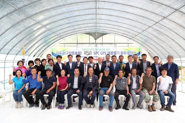 무풍면 반딧불 여름딸기 재배단지 내에서 진행된 이날 협약식에는 황인홍 무주군수와 유송열 무주군의회 의장, 구천동농협 양승욱 조합장, SPC GFS 백승훈 상무를 비롯한 관계자 등 40여 명이 참석했다.
