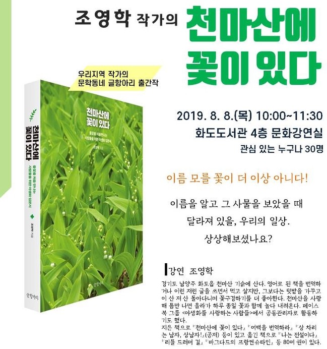 남양주시 화도도서관은 오는 8월 8일 도서 ‘천마산에 꽃이 있다’의 조영학 작가 강연회를 마련해 천마산의 야생화에 대한 이야기를 풀어낸다.
