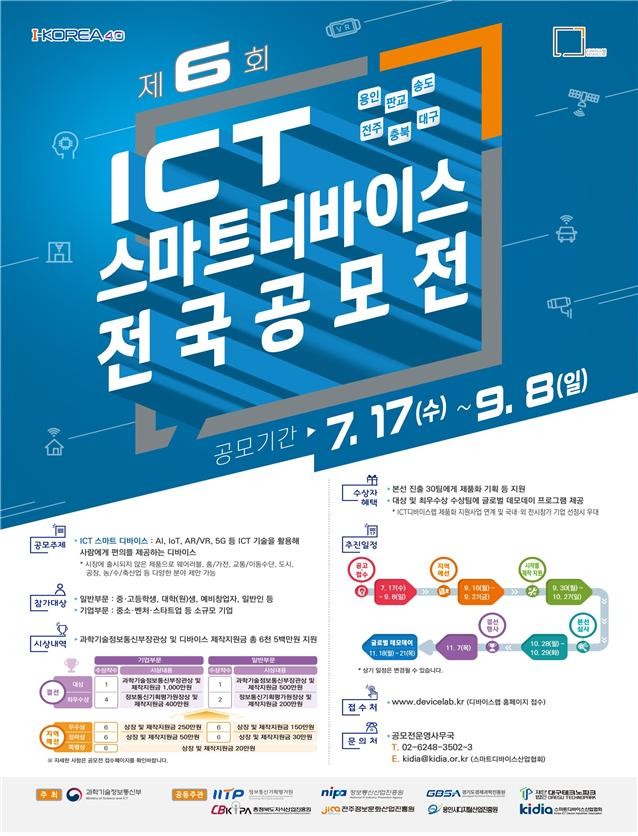 과학기술정보통신부는 혁신 경제 실현을 위한 5G+ 전략의 주요산업인 스마트 디바이스 분야의 우수 아이디어 발굴과 제품화를 지원하는‘제6회 ICT 스마트 디바이스 전국 공모전’을 개최한다.