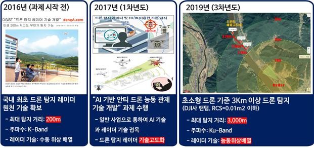 DGIST 연구팀은 2016년 국내 최초로 200m 이상 탐지 가능한 레이더 시스템을 자체 개발한 데 이어, 이번에는 순수 국내 기술로 3km 이상 떨어져 비행하는 초소형 팬텀 드론을 알아차리는 ‘드론 탐지 레이더 시스템’을 개발했다.