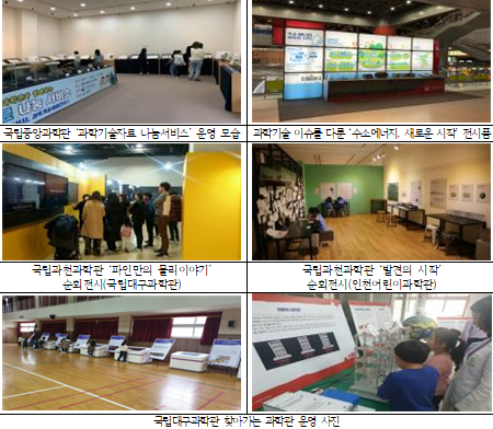 중앙과학관의 ‘과학기술자료 나눔서비스’, 대구과학관의 ‘찾아가는 과학관’, 부산과학관의 ‘찾아가는 작은과학관’ 이 운영되고 있으며 동식물·화석 표본, 과학체험전시물 등을 지원한다.