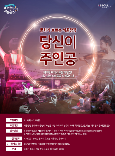 완연한 여름, 서울광장에서 열정 넘치는 시민들의 특별한 공연이 펼쳐진다. 서울시는 오는 18일부터 28일까지 서울광장 무대에서 공연하고 싶은 시민 아티스트들을 모집한다. 영상심사와 공개 오디션을 거쳐 최종 선발된 8개 팀은 8월 20일 ‘문화가 흐르는 서울광장’ 여름 특별공연 ‘당신이 주인공’ 무대에 정식으로 오르게 된다.