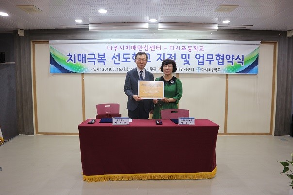나주시는 지역사회 치매 친화적 환경조성을 위한 치매극복 선도학교로 다시초등학교를 지정, 16일 업무협약을 체결하고 지정 현판을 전달했다.