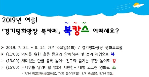 경기도는 오는 7월 24일부터 8월 14일까지 4주간 경기도청 북부청사 경기평화광장 북카페에서 ‘2019년 여름 경기평화광장 북카페로 여름 북캉스 오세요~’라는 주제로 다양한 체험 프로그램을 추진한다고 밝혔다.