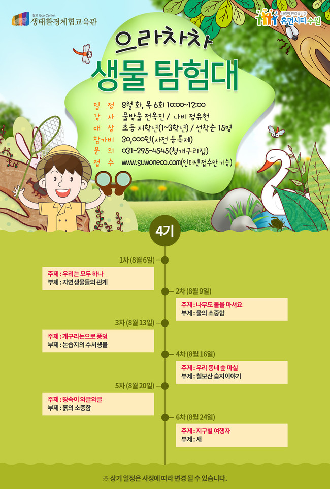 수원시 칠보생태환경체험교육관이 여름방학을 맞아 생물 다양성 탐사 프로그램 ‘으라차차 생물 탐험대’에 참여할 어린이를 20일까지 모집한다.