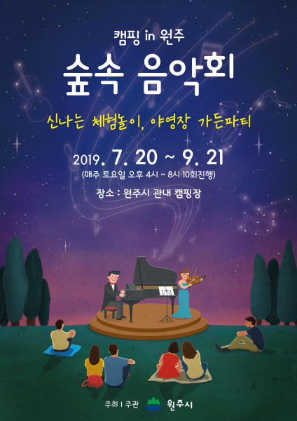 원주시가 숲속 음악회·신나는 체험놀이 및 야영장 가든파티를 테마로 오는 20일부터 9월 21일까지 매주 토요일마다 관내 등록야영장 10곳에서 야영장 활성화 프로그램을 운영한다.