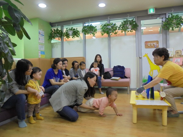 길꽃 어린이 도서관에서 아기와 엄마가 아장아장책놀이 프로그램에 참여하고 있다.