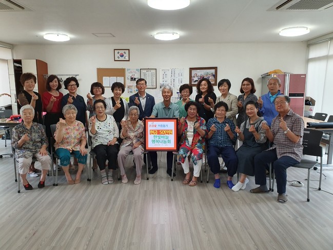 윤승현 운정3동장, 지역사회보장협의체, 한빛바늘 행복나눔회와 자수활동 어르신 등 30여명이 참석한 가운데 경로당 어르신들이 직접 자수를 놓아 만든 손수건, 브로치 등을 판매해 얻은 수익금 50만원을 기탁했다. 또한 이날 오찬은 손정애 한빛마을 행복나눔 대표가 회한양유통이 후원한 국내산 돼지뼈로 만든 감자탕을 대접했다.