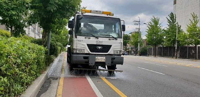 도시 열섬화 방지를 위해 살수차가 주요간선도로에 살수하는 모습