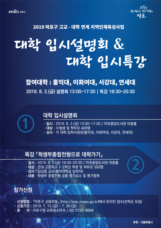 마포구가 대입 수험생과 학부모들을 대상으로 하는 대학입시설명회 및 대학입시특강을 오는 8월 2일 오후 1시 마포중앙도서관에서 개최한다고 밝혔다.