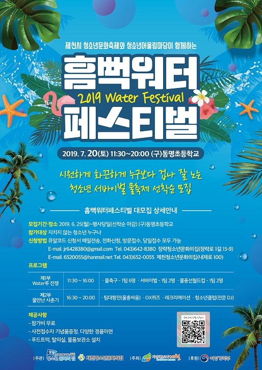 제천시는 오는 20일 오후 1시 동명초 운동장에서 여름방학을 맞이하는 청소년들을 위해 2019 제천시 청소년문화축제와 청소년어울림마당이 함께하는 ‘흠뻑워터 페스티벌’을 개최한다.