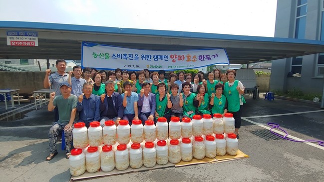 안성시 양성면 새마을부녀회는 지난 16일 양성면사무소 주차장에서 농산물소비촉진을 위해 ‘양파효소 만들기’ 행사를 개최했다