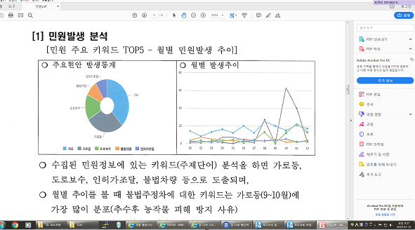 2018년 금산군에 접수된 ‘국민신문고’민원데이터 자료를 분석한 내용에 따르면, 가로등, 도로보수, 인허가조달, 불법주정차차량 등 순으로 주민의 생활과 밀접한 교통, 안전, 환경분야의 민원 발생빈도가 높았다.