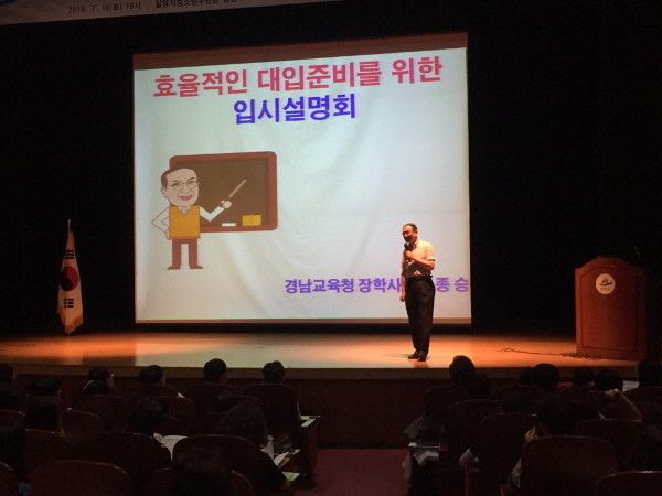 이날 설명회에는 경상남도 교육청 김종승 장학사를 초청해 2020학년도 대학입시제도의 특징, 수능과 주요대학 수시전형 지원방향 뿐 아니라 대입을 준비해야 할 고등학교 1, 2학년 학생들을 위한 입시 제도의 변화와 전망 등도 함께 강의해 참석한 학부모와 학생들에게 큰 호응을 얻었다.
