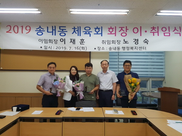 동두천시 송내동 체육회는 송내동 행정복지센터에서 송내동 체육회장 이·취임식을 개최했다. 이날 이·취임식에서는 이재훈 회장의 뒤를 이어 노경숙 체육회장이 취임했다.