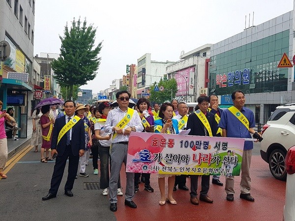 전북노인복지효문화연구원 익산지부는 17일 익산역광장에서 효문화 거리캠페인 발대식을 갖고 중앙동 일대에서 거리캠페인 행사를 전개했다.