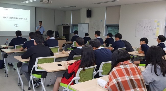 사회적경제연구학교인 마송중학교 학생 및 교사 40여 명은 지난 16일 사회적경제 현장 견학으로 ‘김포시사회적경제지원센터’를 방문했다.