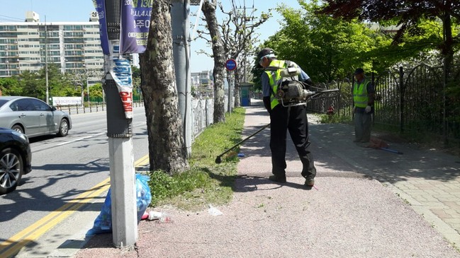 무성하게 자란 도심 곳곳의 녹지대의 풀을 깎고, 수목생육에 피해를 주는 잡초 제거작업을 실시한다.