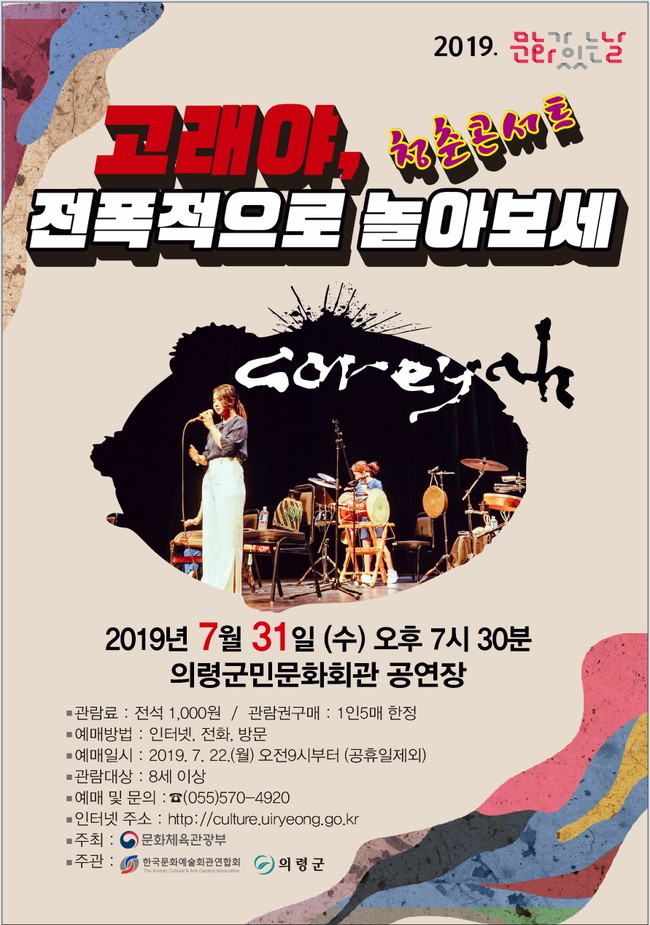 의령군은 오는 31일 오후 7시 30분에 지역문화예술회관 문화가 있는 날 공연산책‘문예회관 기획프로그램’인 2019 문화가 있는 날-청춘콘서트‘고래야 전폭적으로 놀아보세’를 공연한다.