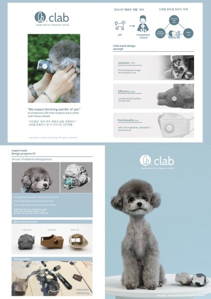 클랩에서 개발한 반려견 전용 미세먼지 마스크는, 반려견의 구강구조를 3D로 스캔해 다양한 견종의 체형과 두상을 고려해 제작한 것으로 필터 교체가 가능해 경제적이며, 반려견의 호흡상태를 알려주는 센서가 부착돼 있는 게 특징이다.