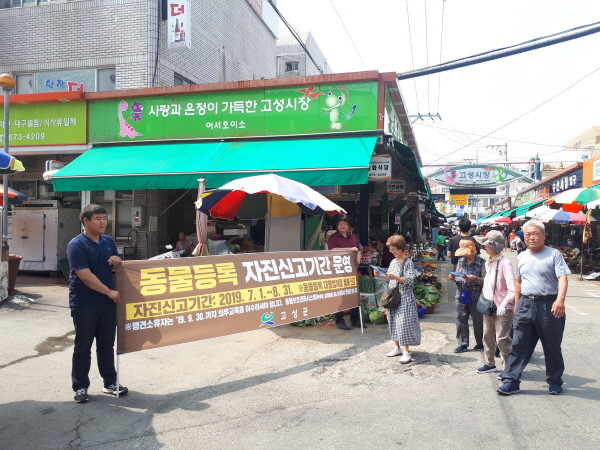 고성군은 지난 1일부터 오는 8월 31일까지 2개월간 동물등록 자진신고 기간을 운영함에 따라 지난 16일, 유동인구가 많은 고성시장을 중심으로 동물 등록률 제고를 위한 홍보 캠페인을 펼쳤다.