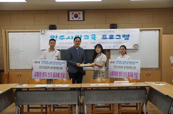 녹동고등학교는 지난 16일 학교 도서관에서 학생자치회가 주관한 마리안느와 마가렛 노벨평화상 수상 희망 편지쓰기 결과물을 사)마리안느와 마가렛 나눔연수원측에 전달했다.