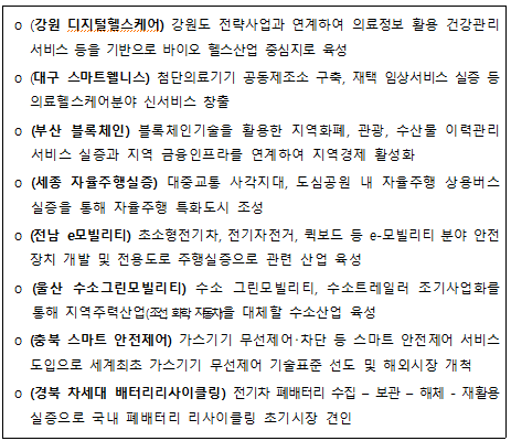 지자체가 요청한 규제샌드박스의 주요내용을 살펴보면, 개인정보, 원격의료, 자율주행, 전기차, 가스 무선제어 등 4차 산업혁명의 핵심분야를 총 망라하는 신산업·신기술 분야 규제특례로 구성되어 있다.