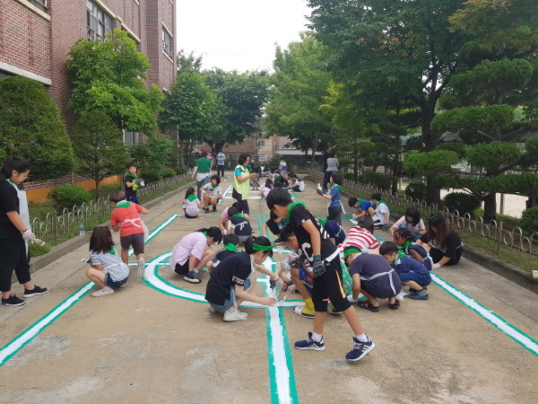 능길초등학교 전교생 82명이 17일 학교 바닥에 전통놀이 그림을 함께 그리는 사업이 진행됐으며, 참여 학교별로 일정에 따라 순차적으로 진행될 예정이다.