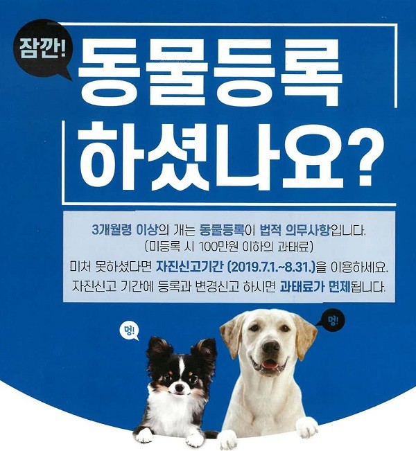 김창열 친환경농정과장은 “이번 자진신고 기간을 계기로 반려동물 등록을 통해 유실·유기를 방지하고 성숙한 반려문화 정착을 위해 앞장서주길 바란다”고 당부했다.