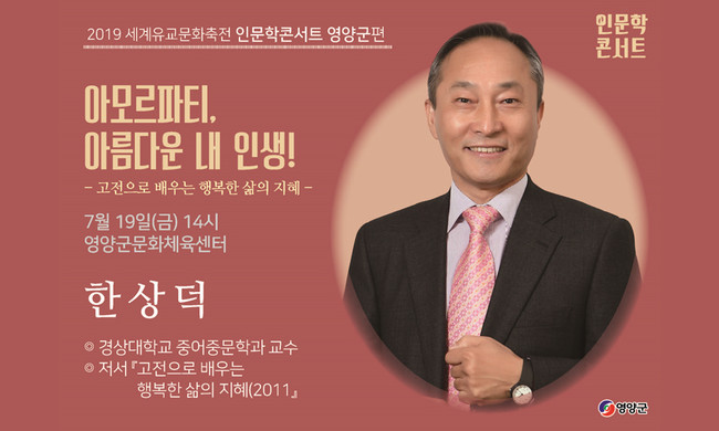 영양군은 2019 세계유교문화축전 인문학콘서트를 ‘아모르파티, 아름다운 내 인생’이라는 주제로 오는 19일 오후 2시 영양군 문화체육센터에서 개최한다.
