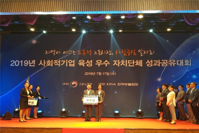 시상식은 지난 17일 고용노동부, 지방자치단체 및 고용노동관서 등 150여 명이 참석한 가운데, 서울 양재 aT센터에서 열리는 ‘2019년 사회적기업 육성 성과공유 대회’에서 개최됐다.